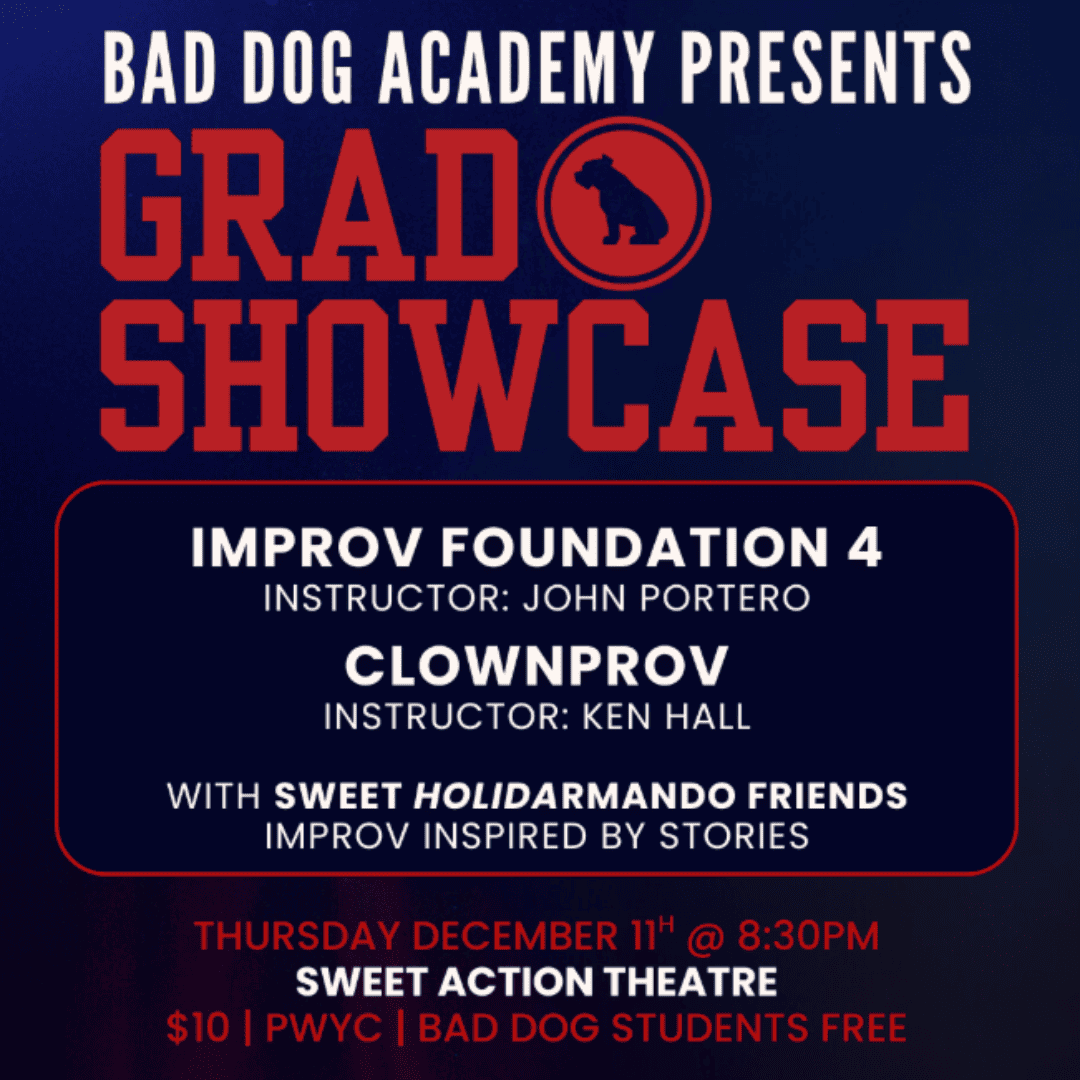 Watch our talented Bad Dog Academy Graduates do Their Thing! This brilliant showcase features performances by John Portero's Armando Class, with Ryan Sheedy's Shortform Studio 1