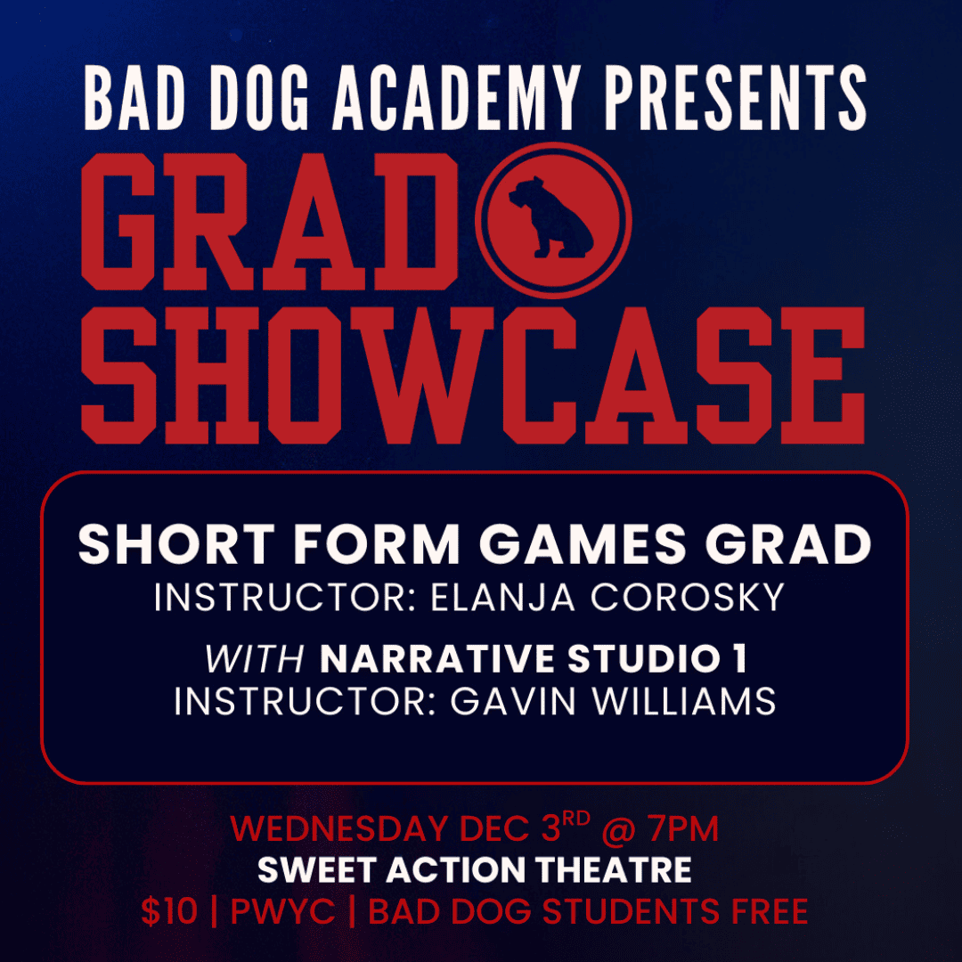 Watch our talented Bad Dog Academy Graduates do Their Thing! This brilliant showcase features performances by Elanja Corosky's Shortform Games Class and Gavin Williams' Narrative Studio