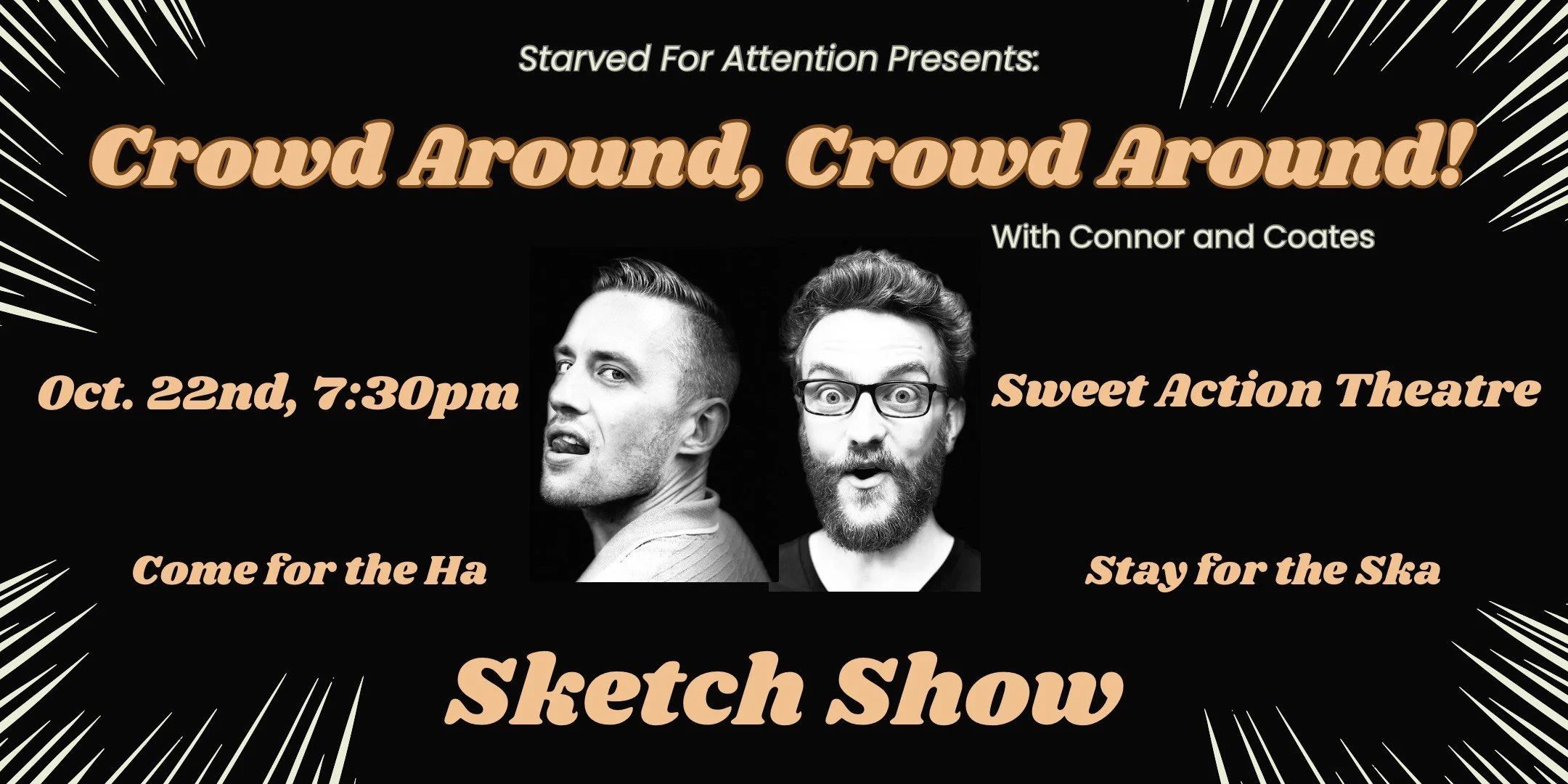 Welcome to Crowd Around, Crowd Around! Get ready for an evening filled with laughter, and fun at Sweet Action Theatre. Join us on Tue Oct 22 2024 at 7:30 PM for a memorable experience. We're Starved for Attention and we need YOU to feed us. Let's meet the duo that's hungry for your laughter: