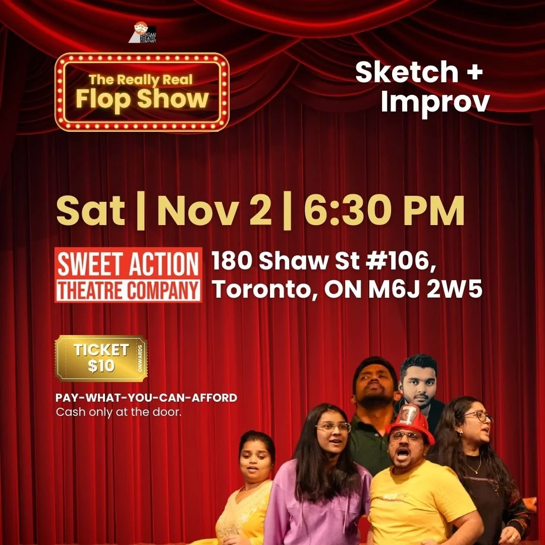 The Really Real Flop Show is a one-of-a-kind comedy event that combines sketch comedy and improv games, presented by an ensemble of experienced actors and first-time comedians. Directed by Tushar Dalvi, Artistic Director of Rangaai Theatre Company, the show promises a blend of spontaneous hilarity, scripted sketches, and audience interaction, making each performance unique.