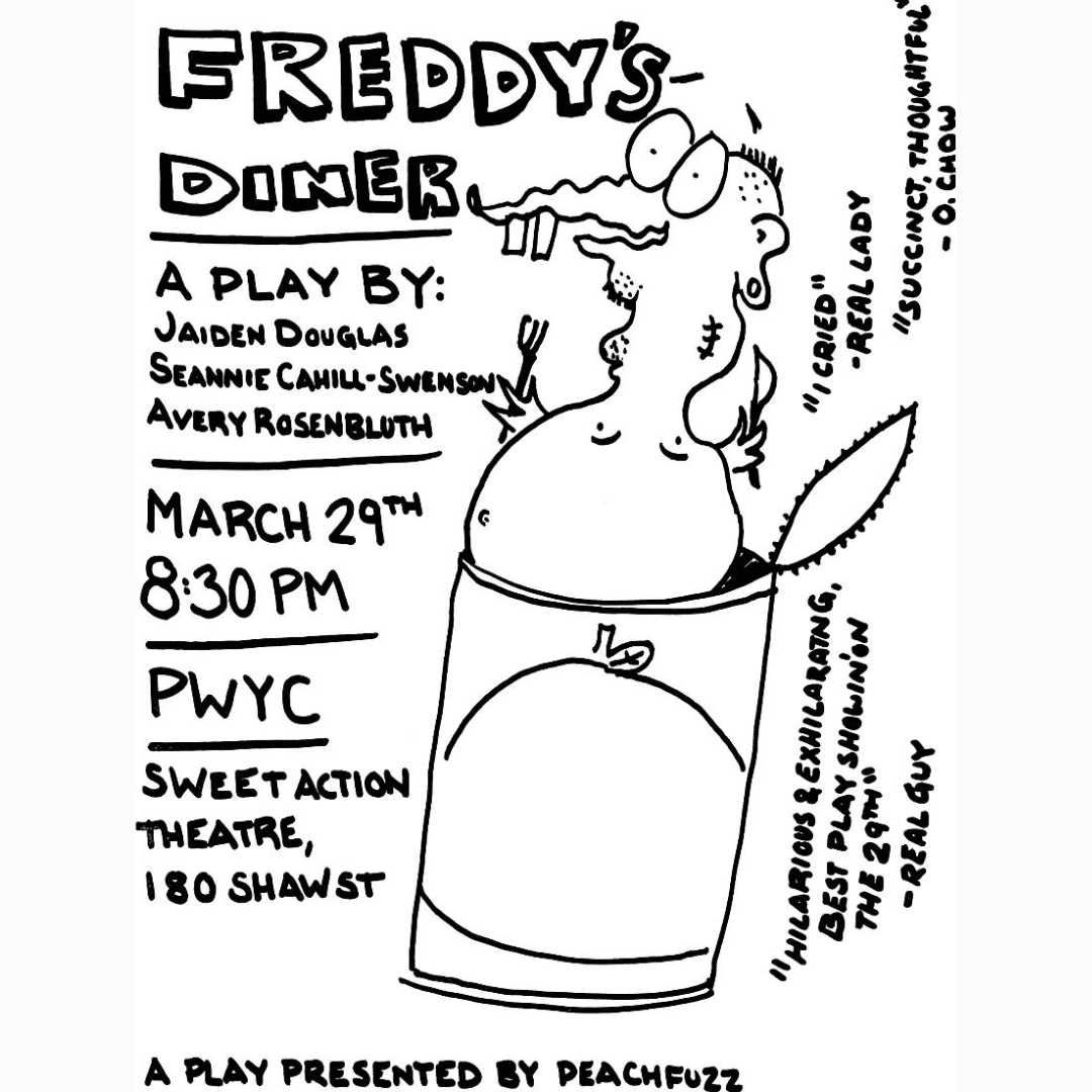 Welcome to Freddy’s Diner, a play by Jaiden Douglas, Seannie Cahill-Swenson, and Avery Rosenbluth produced by PeachFuzz Theatre.